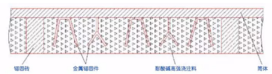 采用上述澆注料在回轉窯筒體的內表面上澆注厚度不低于250mm。內襯包括多塊呈軸向均勻分布固定于筒體內表面的酸性或中性錨固磚,錨固磚兩側的筒體內表面固定有多個均勻分布的金屬錨固件,再用耐酸堿高溫澆注料,該耐酸高強澆注料通過錨固磚和金屬錨固件與筒體連接為一體。局部內襯結構如圖1所示。