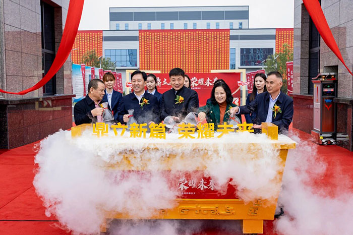 祥瑞盈門,宏圖待展。在激動人心的主題啟動環(huán)節(jié),孫琪、張新亮、孟彩虹、楚科奇、白建偉等五位領導共同登臺。隨著全場齊聲倒數(shù)“五、四、三、二、一!”,他們一同將象征著光榮與夢想的甘露注入啟動臺。瞬間,霧氣奔涌,“鼎立新篇,榮耀未來”八個大字磅礴升起,氣貫長虹!寓意著河南榮盛科技集團一個全新的時代正式開啟,未來必將大氣磅礴,景象萬千!